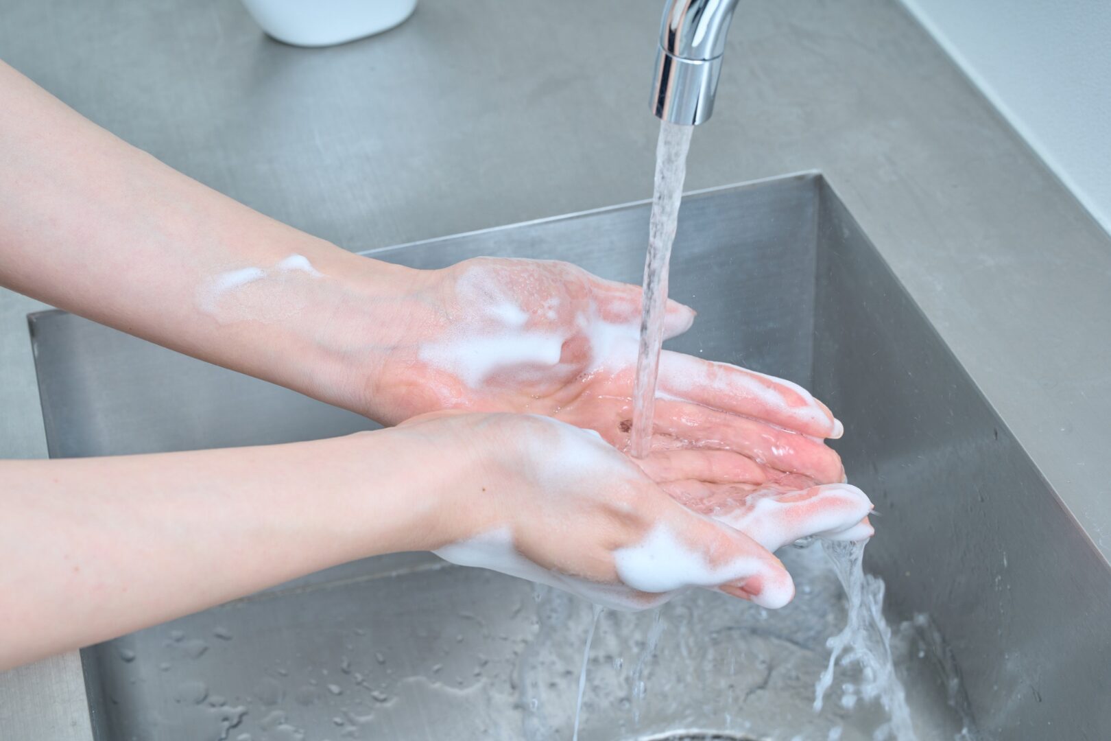 外から持ち帰るウイルス量を減らすことで、体内防御の負担を小さくできます。流水と石けんで20秒以上手をこするだけで、付着したウイルスは100分の1以下に減少します。